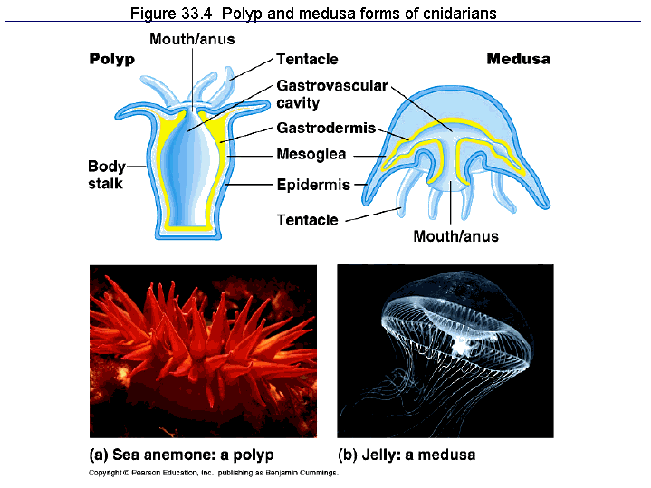Yet another group at the base of the metazoan family tree are the Cnidarians (jellyfish, sea anemones, corals) which are, along with sponges, among the earliest multicellular organisms found in the fossil record (also late pre-Cambrian). Cnidarians radially symmetrical and develop from two primary germ layers (diploblasty). They basically have a cup or bowl shaped anatomy with a single opening for use as both mouth and anus, and the inside of the ‘cup’ forming the gut where food is digested. As with placozoans digestion is extracellular.