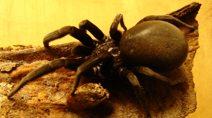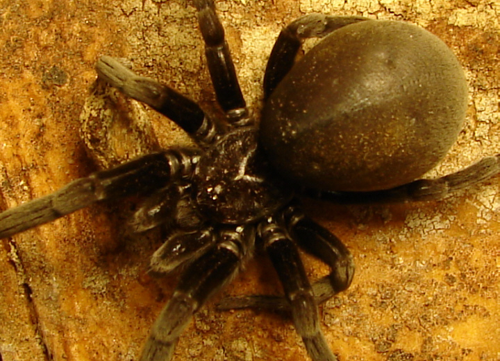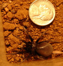 OK, so it’s not a bird eating spider, the size of a dinner plate, but outside of a full blown tarantula it is the biggest spider I’ve seen in the wild around these parts (Southern California) since I was a kid. My first attempt at an identification would be a California trapdoor spider (Bothriocyrtum californicum), though it looks a little different from the pics I can find on the web and I didn’t find it associated with a trapdoor setup. It was just clinging to a bit of old prickly pear skin (an environment it was sharing with literally hundreds and hundreds of Eleodes).