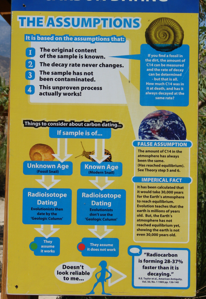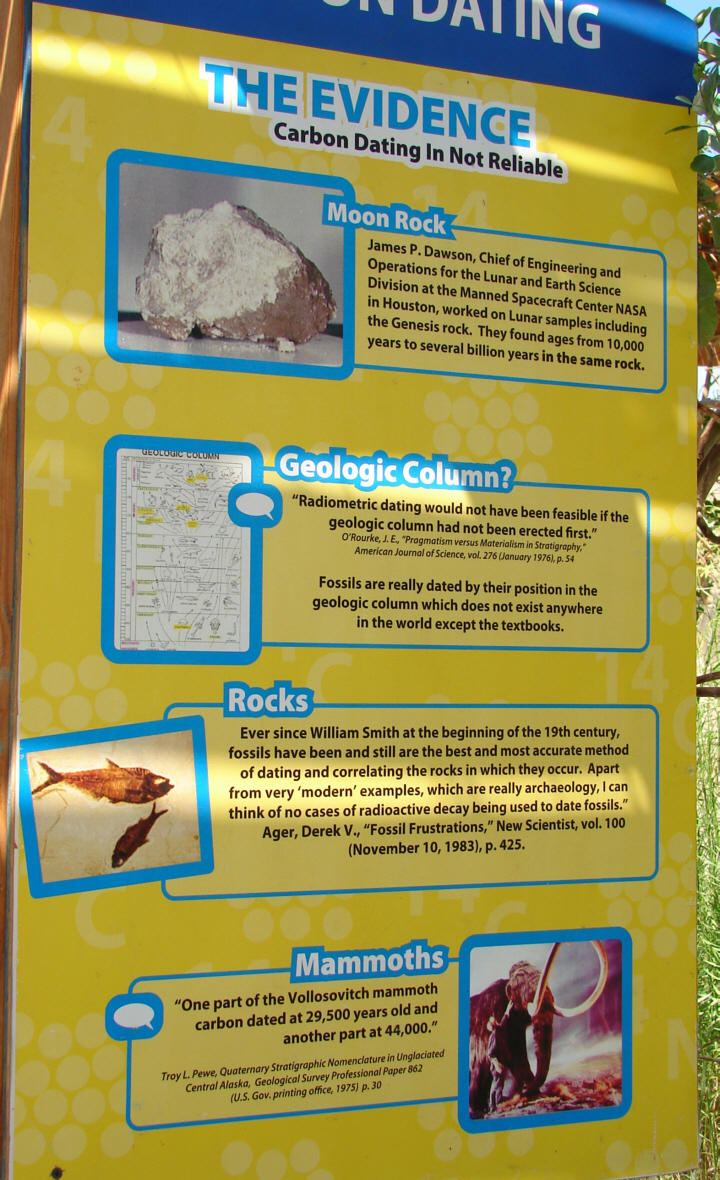 Next, there where several placards on “carbon dating” (a.k.a. radiocarbon dating) which YEC seem to be obsessed with criticizing in the context of the age of the Earth and of various fossils.  What is odd about this is that carbon 14 (14C), or radiocarbon, dating is really primarily used by archeologists to date objects (wood or bone) that are around 60,000 years or younger and never by geologist or paleontologists who use other radiometric dating techniques to date the age of the Earth or fossils (or rather igneous rock layers adjacent to sedimentary layers containing fossils).  And while I am by no means an expert in radiometric dating I could spot several problems with what they had posted and with a little research I uncovered even more.