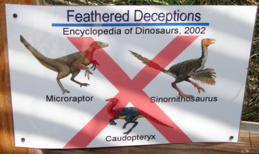Next we have a sign apparently intended to denounce some of the many feathered dinosaur fossils that have been discovered in the last decade as “feathered deceptions”: