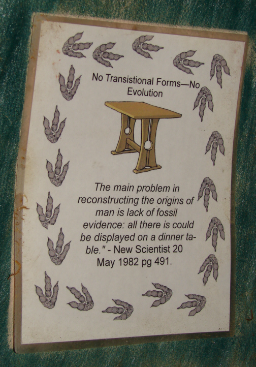 This merry little band of creationists sometime can’t even keep their stories straight from one sign in the attraction to another. For example, on one sign they present the syllogism “No transitional forms – no evolution” and in support of this  they give an anonymous quote from New Scientist magazine essentially saying that all the fossil evidence for human evolution could fit on a “dinner table”: