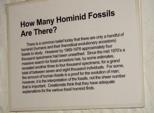 However on another sign headlined “How many hominid fossils are there?”, they inform us that while it is a “common belief” that there are only a handful of hominid fossils, there were in fact, already “approximately four thousand specimens” unearthed by the mid-1970’s and many more have been found since that time, but that numbers of fossils aren’t really important, rather it is how we interpret them.