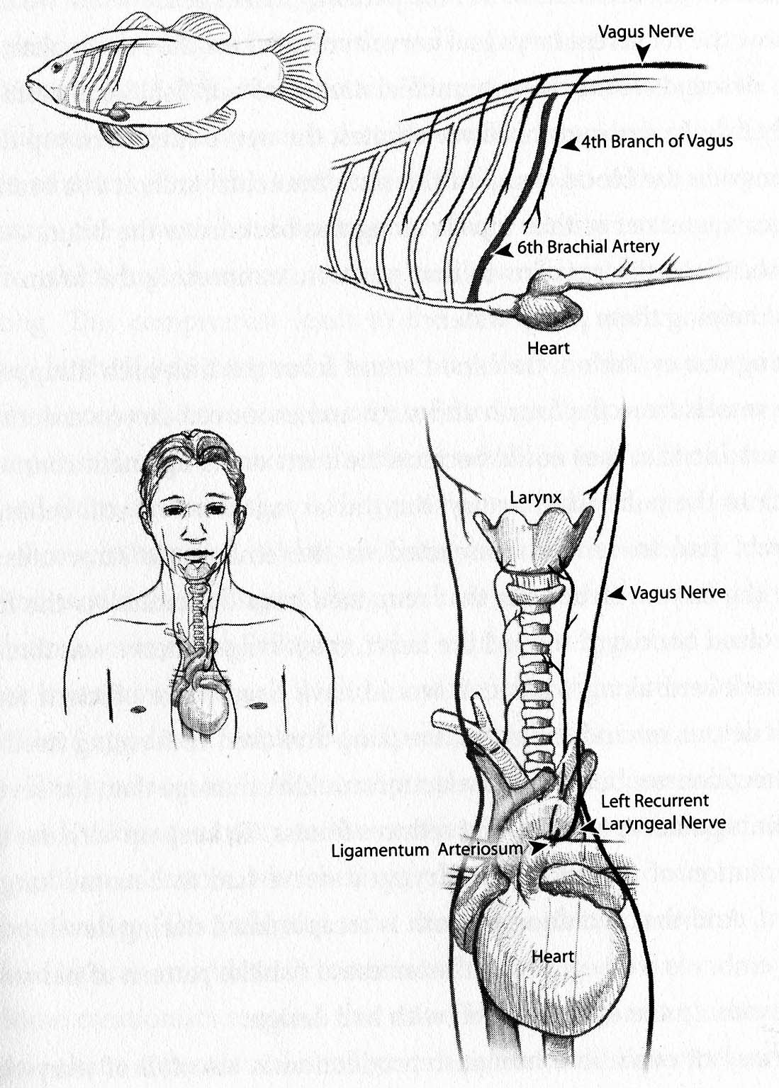 However, as we saw earlier the in mammals the 4th and 6th pharyngeal arches fuse—after the transitory 5th arch is reabsorbed. The 4th/6th arch, modified by development then contributes to the formation of the larynx. The trick is that when the extended neck evolved in amniotes and the 4th branch of the vagus nerve—now called the recurrent laryngeal nerve—got hooked by the 6th aortic arch and dragged down into the chest, changing what was a fairly straight shot along the 6th gill arch in “fish”, into a circuitous route wherein the vagus nerve come out of the base of the brain travels down into the chest, loops around the pulmonary artery and then goes back up the neck into the larynx.