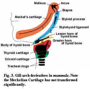Each pharyngeal arch sports a cartilaginous bar, the first (mandibular) arch, as was noted earlier, develops into the jaw bones of all jawed vertebrates. In reptiles and birds this constitutes multiple bones of the lower jaw; while in mammals it develops into the singular lower jaw bone (the mandible) and two of the bones of the middle ear (the incus and the malleus). See: “Evolution of mammalian auditory ossicles“