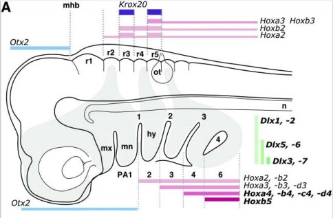 A nested set of Hox genes control the development of the pharyngeal structures head to tail (anterior to posterior) from just after the first pharyngeal arch (Hunt et al. 1991) (Prince et al. 1998) (Kuratani 2004). And likewise a nested set of Dlx gene are expressed in the development of the pharyngeal structures in the front to back (ventral/dorsal) direction (Schilling 2003) (MacDonald et al., 2010).