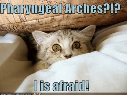 Here is an illustration that I grabbed off the ‘interwebs’ and modified to show the relationships of the different elements found in the pharyngeal structures of vertebrate embryos: