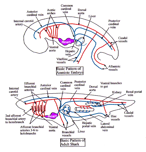 From Eastern Kentucky University BIO 342 Comparative Vertebrate Anatomy site, with modifications (I colored and labeled the hearts).