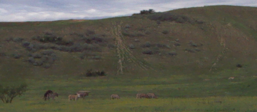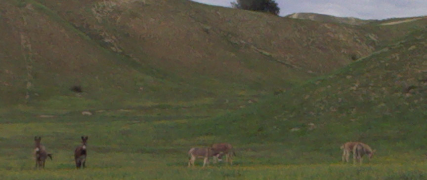 While driving through a local rural area (Reche Canyon) my wife and I spotted a herd of feral burros (Equus africanus asinus) that we had heard (get it?) lived in the area. I wasn’t able to get too close to them and only had my cell phone camera so these are not the best pictures. However if you look carefully at the second picture below you’ll get a glimpse of some “hot donkey action” going down (brown chicken, brown cow!).