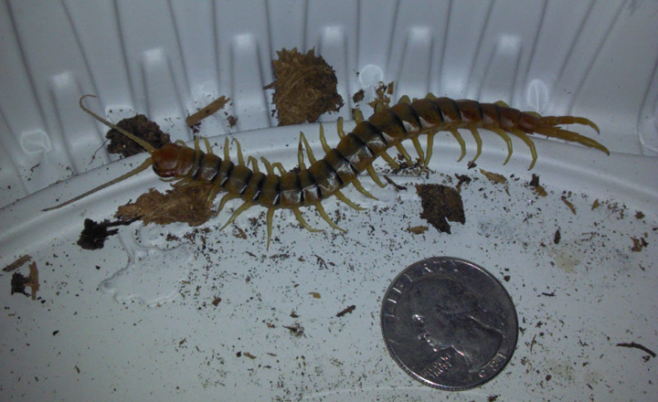This dangerous little bugger was hitchhiking in a load of horse manure that my mother was unloading from the back of her pickup truck. A centipede, probably a Scolopendra polymorpha. After I told my mother that I wasn’t interested in adopting it she ended up feeding it to her chickens, which was probably a little spicier than their usual fare.