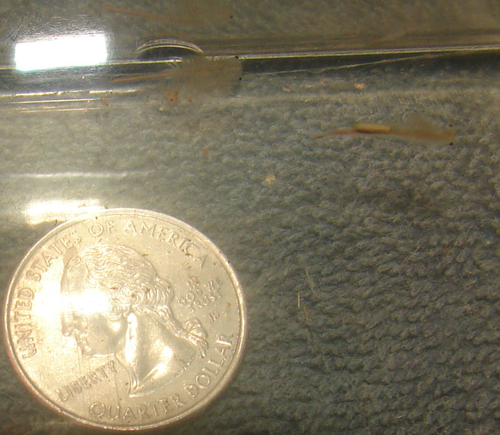 Anyway, after seeing that they were indeed fairy shrimp I rushed home and got one of my critter keepers (a small plastic aquarium) and fashioned a small, pitiful, net out of a coat-hanger and one of my wife’s old nylon stockings. Pitiful as my jury-rigged net was, it allowed me to catch a few of the shrimp.