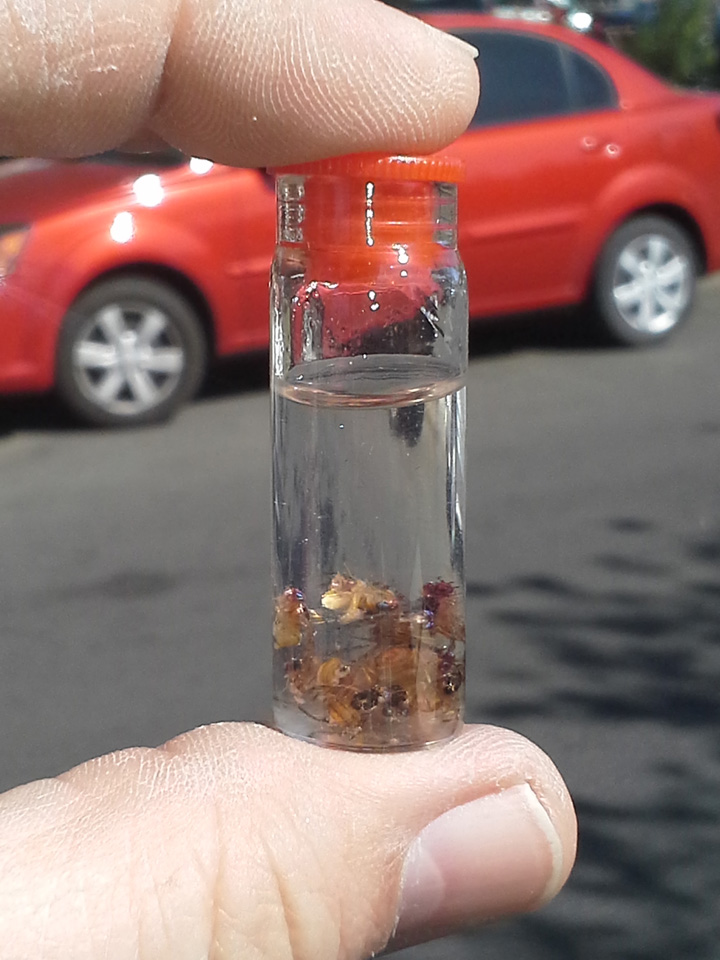 Most, if not all, of these Med Flies are sterile files released by the CDFA as a biological control. However some might be wild flies and that is what I am really looking for, though I don’t make that determination. I simply gather the captured flies up and place them in vials of alcohol: