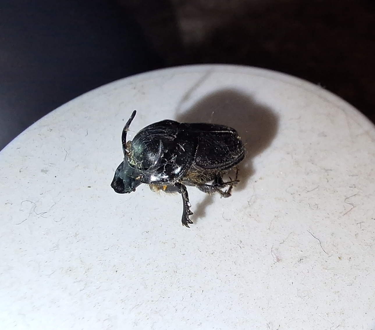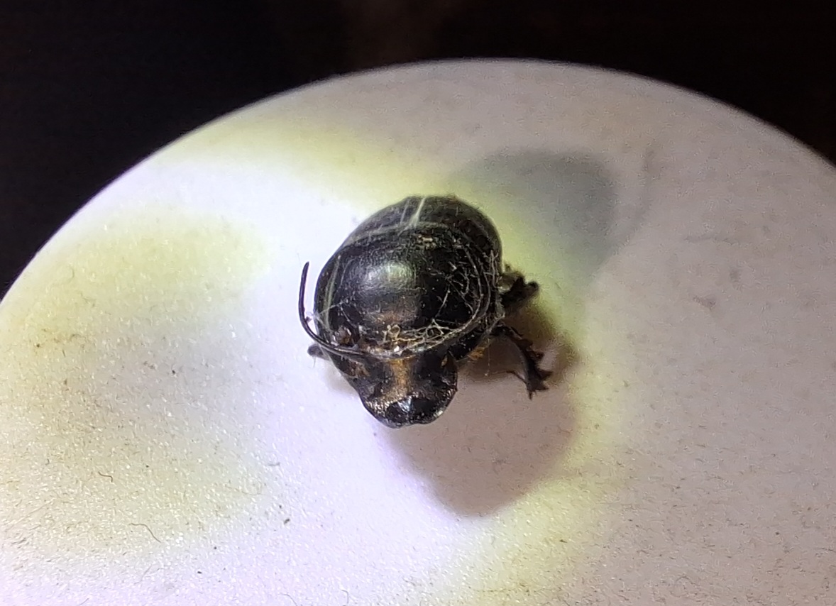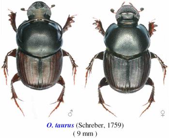I found this little beetle in a Japanese beetle (Popillia japonica) trap several years ago in the vicinity of Ontario, California. I was able to identify it as a male (you can tell by the horns) Onthophagus taurus, a type of dung beetle native to areas around the Mediterranean (southern Europe, North Africa and the middle East). Apparently they were introduced in the U.S. in the late 1960’s to early 1970’s to help control cow dung, and have now spread to most of North America.